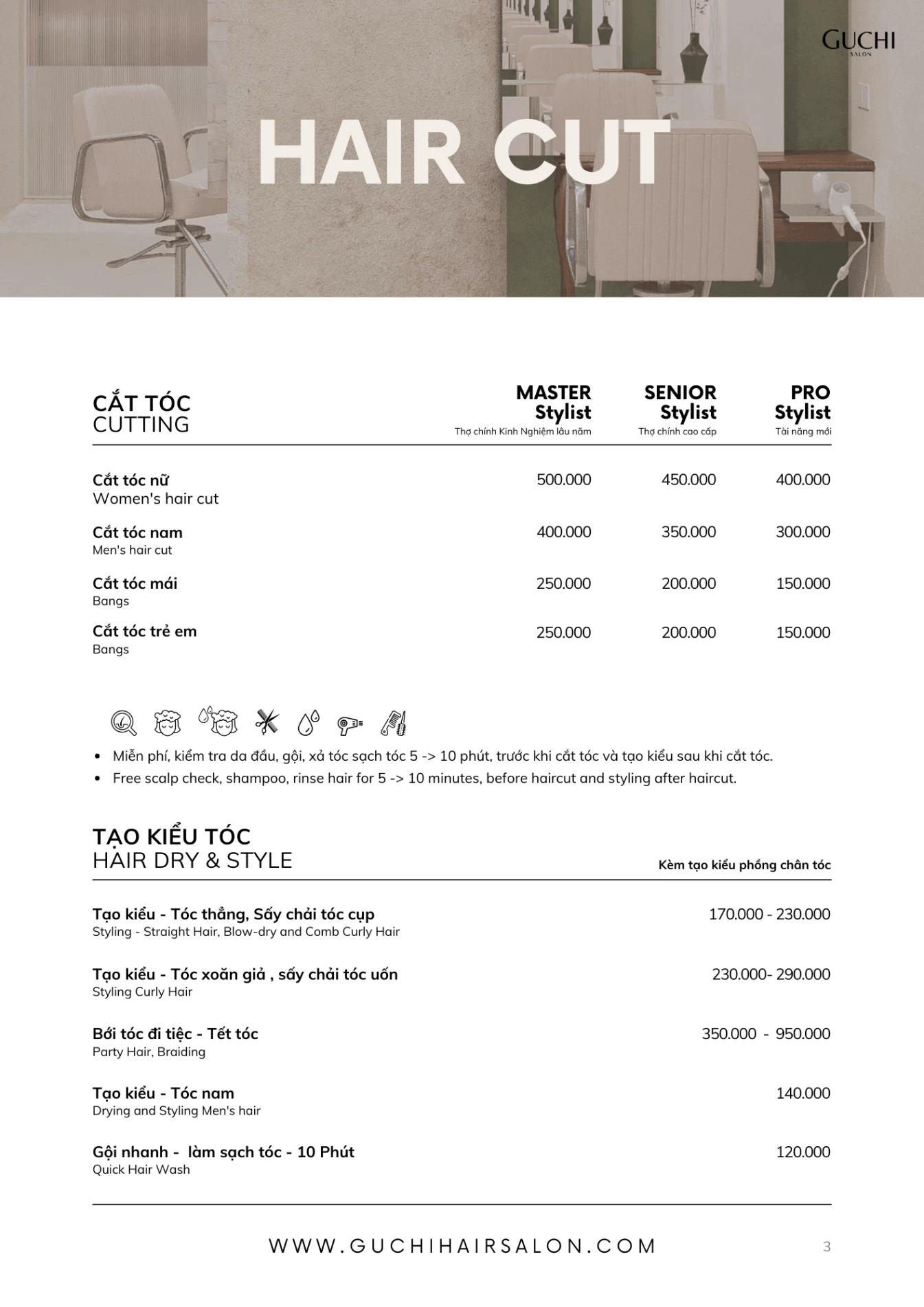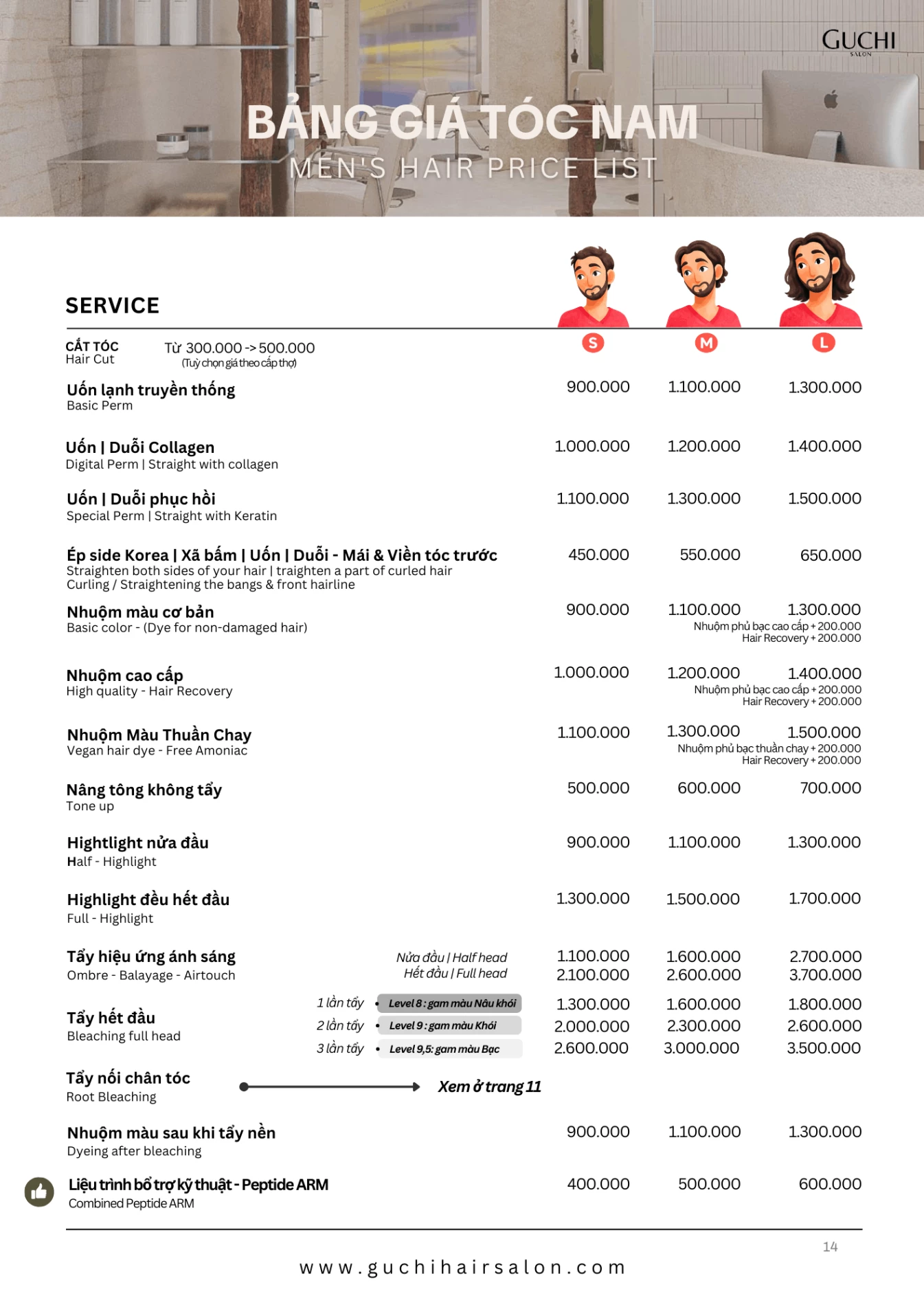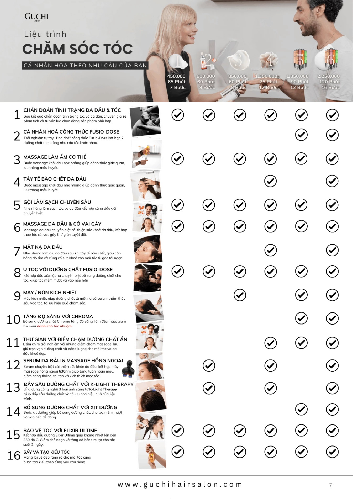 Bạn đang lên kế hoạch thay đổi kiểu tóc, thăng hạng phong cách? Cùng tham khảo các dịch vụ của Guchi Hair Salon. Với kỹ năng điêu luyện và sự sáng tạo, chúng tôi có thể "cân" mọi kiểu tóc: ngắn, dài, uốn, duỗi, nhuộm, tóc nam...
