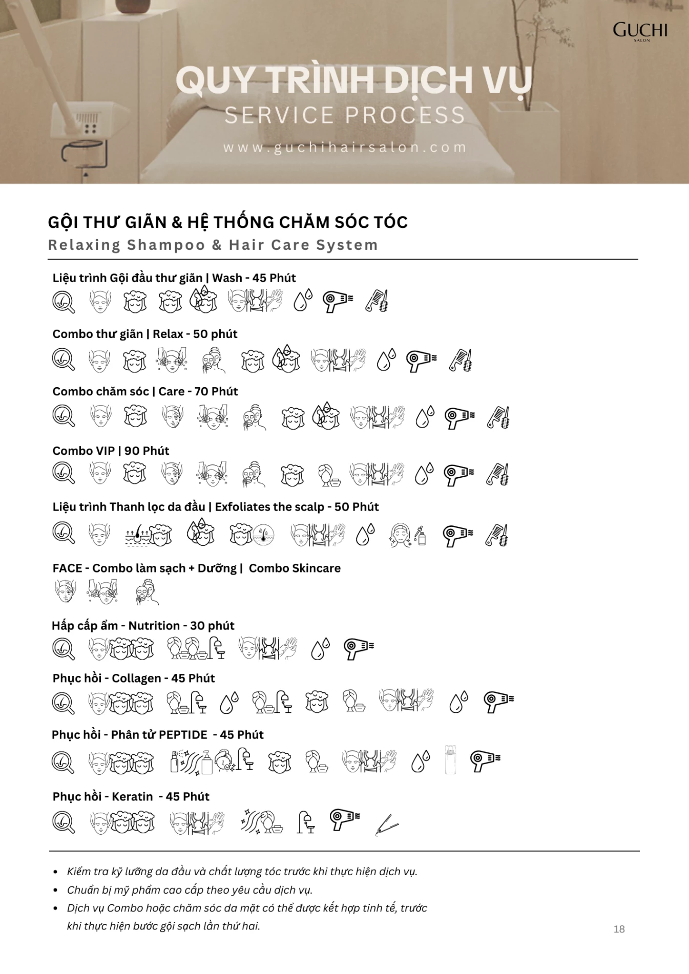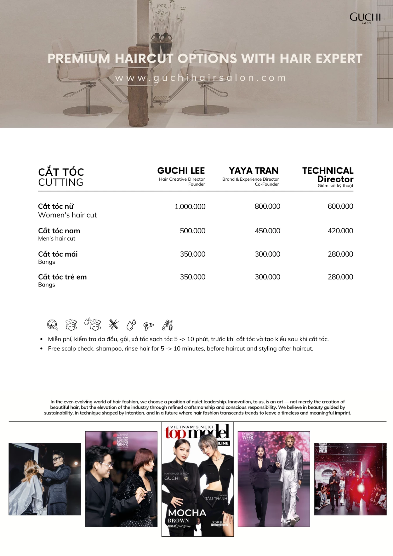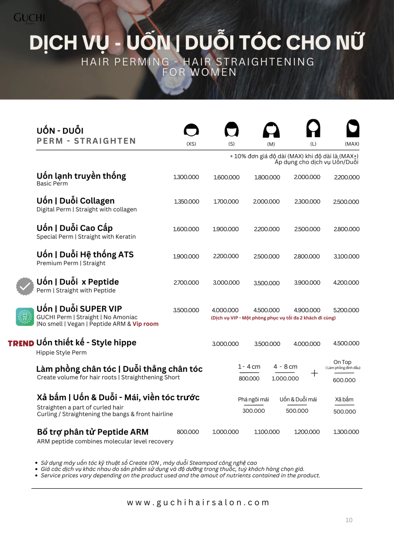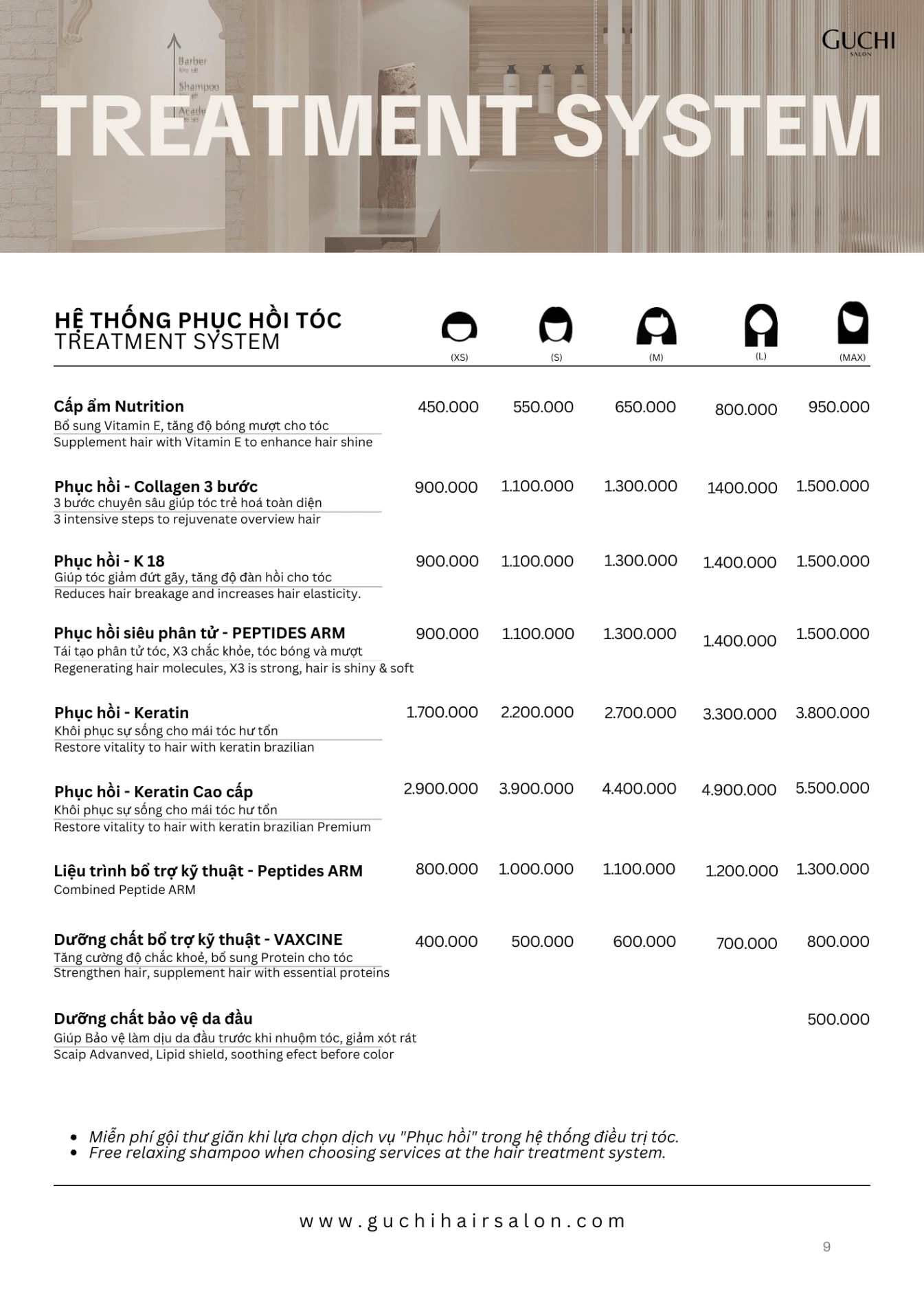 Bạn đang lên kế hoạch thay đổi kiểu tóc, thăng hạng phong cách? Cùng tham khảo các dịch vụ của Guchi Hair Salon. Với kỹ năng điêu luyện và sự sáng tạo, chúng tôi có thể "cân" mọi kiểu tóc: ngắn, dài, uốn, duỗi, nhuộm, tóc nam...